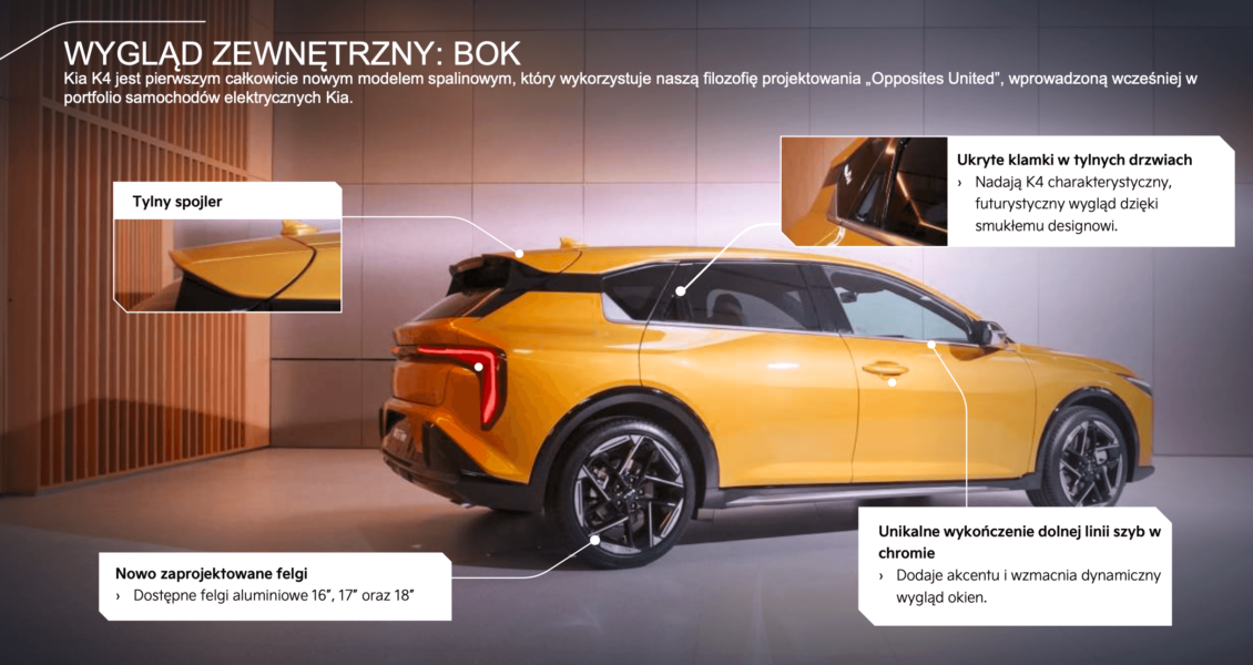 Wygląd Kia K4 można opisać jako wyrazisty, dynamiczny i odważny. Z przodu uwagę przyciągają światła w charakterystycznej sygnaturze Star Map, znanej z modeli Kia EV9 czy Sorento. Charakterystyczny „tygrysi nos” w zderzaku podkreśla przynależność do rodziny Kia. Linia boczna jest elegancka i nowoczesna – ukryte klamki tylnych drzwi oraz efekt „lewitującego dachu” nadają sylwetce lekkości. Tył auta z szerokimi światłami połączonymi listwą optycznie poszerza nadwozie i nadaje mu sportowego charakteru.