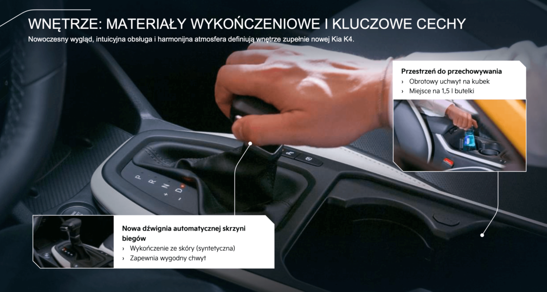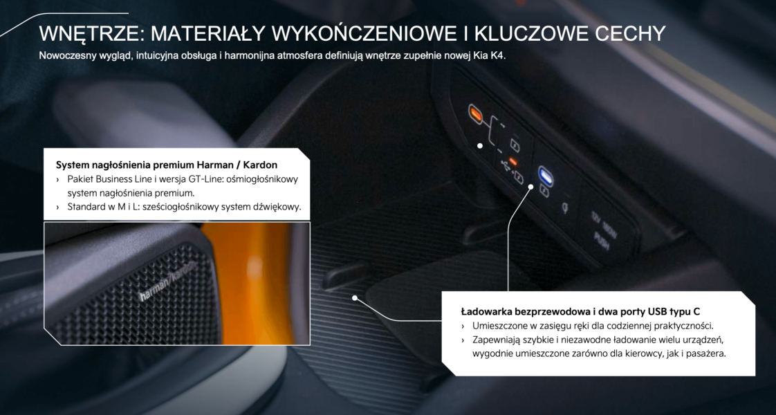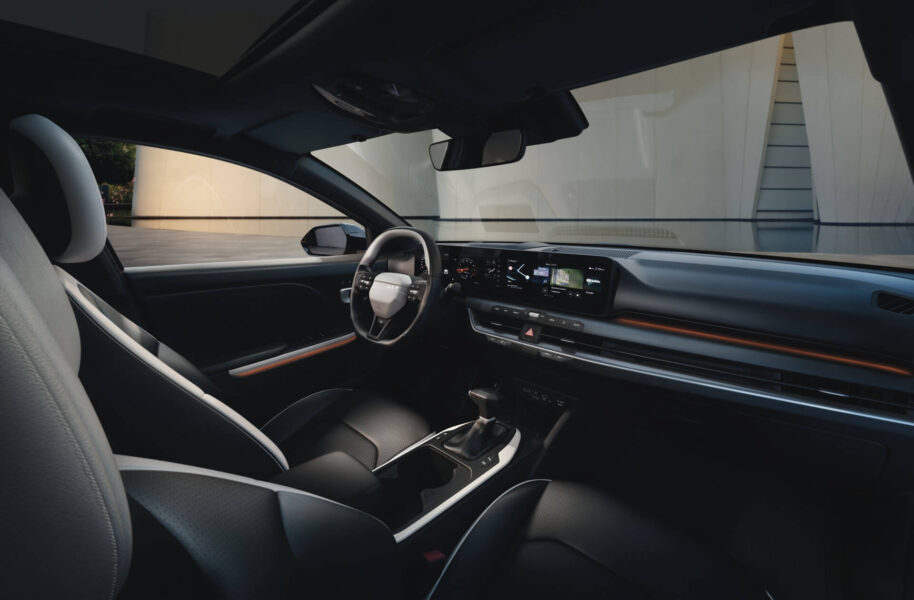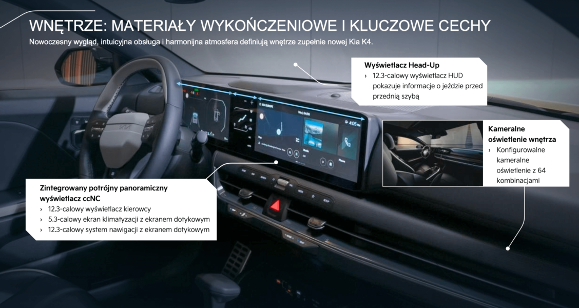 W kabinie Kia K4 uwagę zwraca potrójny panoramiczny ekran ccNC – od wersji L w standardzie, w podstawowej wersji M dostępny w konfiguracji 4” + 5,3” + 12,3”. Do tego dochodzi elegancka deska rozdzielcza z ukrytymi nawiewami, ambientowe oświetlenie oraz praktyczne przyciski do obsługi klimatyzacji i multimediów.