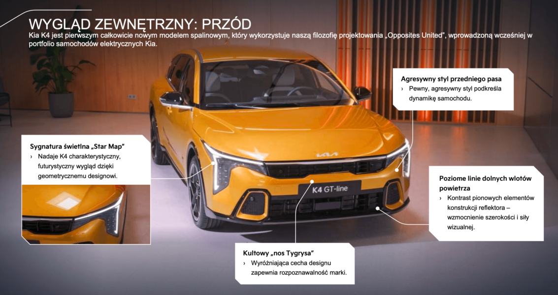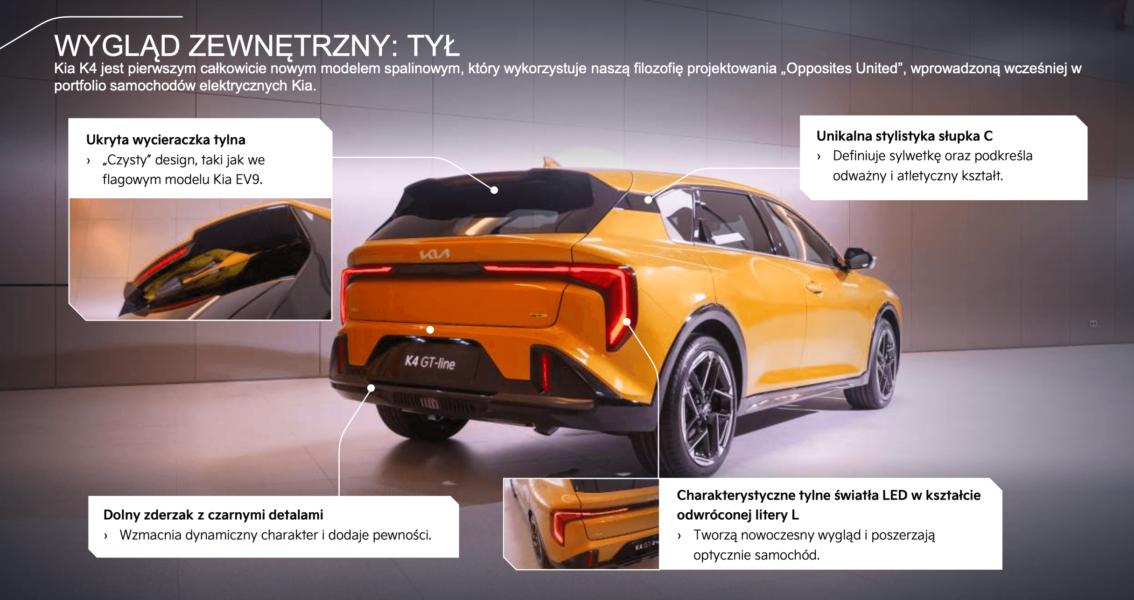 Wygląd Kia K4 można opisać jako wyrazisty, dynamiczny i odważny. Z przodu uwagę przyciągają światła w charakterystycznej sygnaturze Star Map, znanej z modeli Kia EV9 czy Sorento. Charakterystyczny „tygrysi nos” w zderzaku podkreśla przynależność do rodziny Kia. Linia boczna jest elegancka i nowoczesna – ukryte klamki tylnych drzwi oraz efekt „lewitującego dachu” nadają sylwetce lekkości. Tył auta z szerokimi światłami połączonymi listwą optycznie poszerza nadwozie i nadaje mu sportowego charakteru.