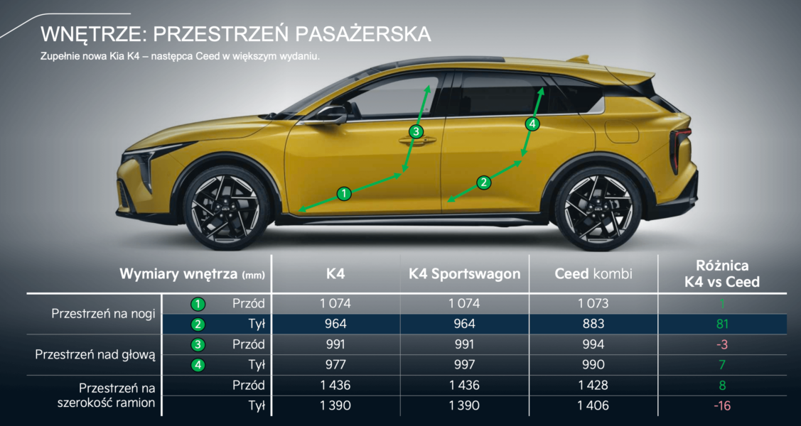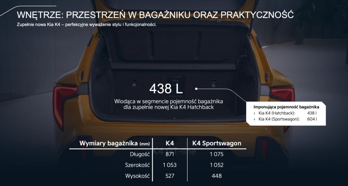 Kia K4 to hatchback o długości 4440 mm, szerokości 1850 mm i wysokości 1435 mm. Rozstaw osi wynosi 2720 mm. Dzięki tym proporcjom samochód oferuje przestronne wnętrze i dynamiczny wygląd. W porównaniu do Volkswagena Golfa, K4 jest aż 16 cm dłuższa, co plasuje ją bliżej segmentu D. Wersja Sportswagon będzie konkurować m.in. ze Skodą Octavią i Toyotą Corollą, oferując lepsze proporcje i większy rozstaw osi.