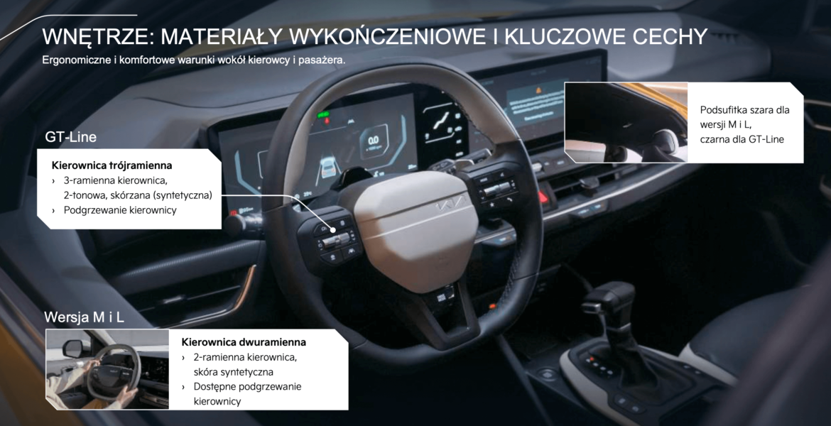 Kierownica w wersji GT-Line ma sportowy, dwukolorowy design, podkreślający charakter auta. System multimedialny obsługuje bezprzewodowe Apple CarPlay i Android Auto, a dzięki usługom Kia Connect kierowcy zyskują dostęp do cyfrowych funkcji i aktualizacji online.